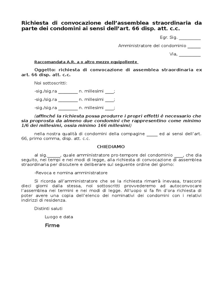 Convocazione assemblea straordinaria da parte dei condomini Secondo l'art. 66 delle disposizioni di attuazione del C.C. (R.D. 30 marzo 1942 n. 318) noi sottoscritti, rappresentando oltre un sesto del valore del fabbricato, abbiamo richiesto per raccomandata A.R. spedita il ___/___/______ all'amministratore del nostro condominio sig. sig.ra ________________________________ di convocare un'assemblea …